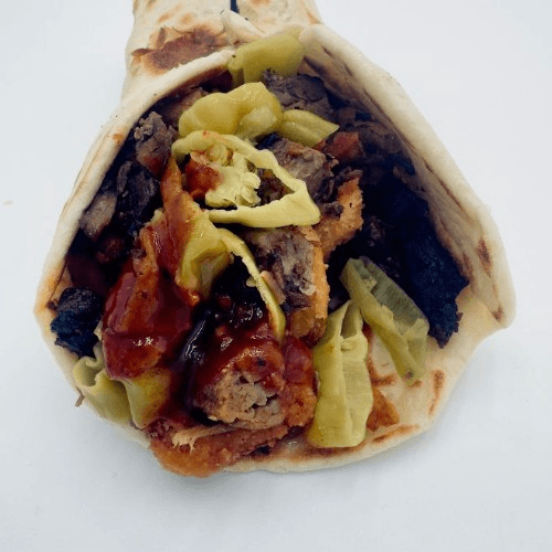 Thinly sliced, rotisserie-roasted, beef and lamb with tomato, red onion, and traditional sauce.