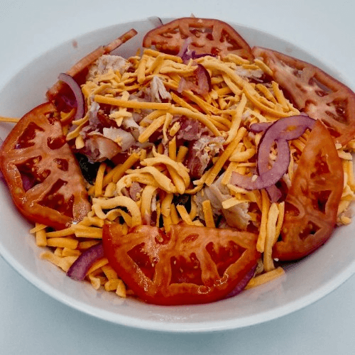 Garden fresh romaine lettuce topped with deep fried onion straws, thin sliced usda choice steak, American cheese and tomatoes.