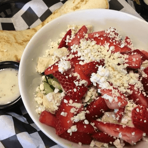 Roasted red pepper hummus topped with cucumbers, lettuce, green peppers, red onions, tomato, and traditional dressing.